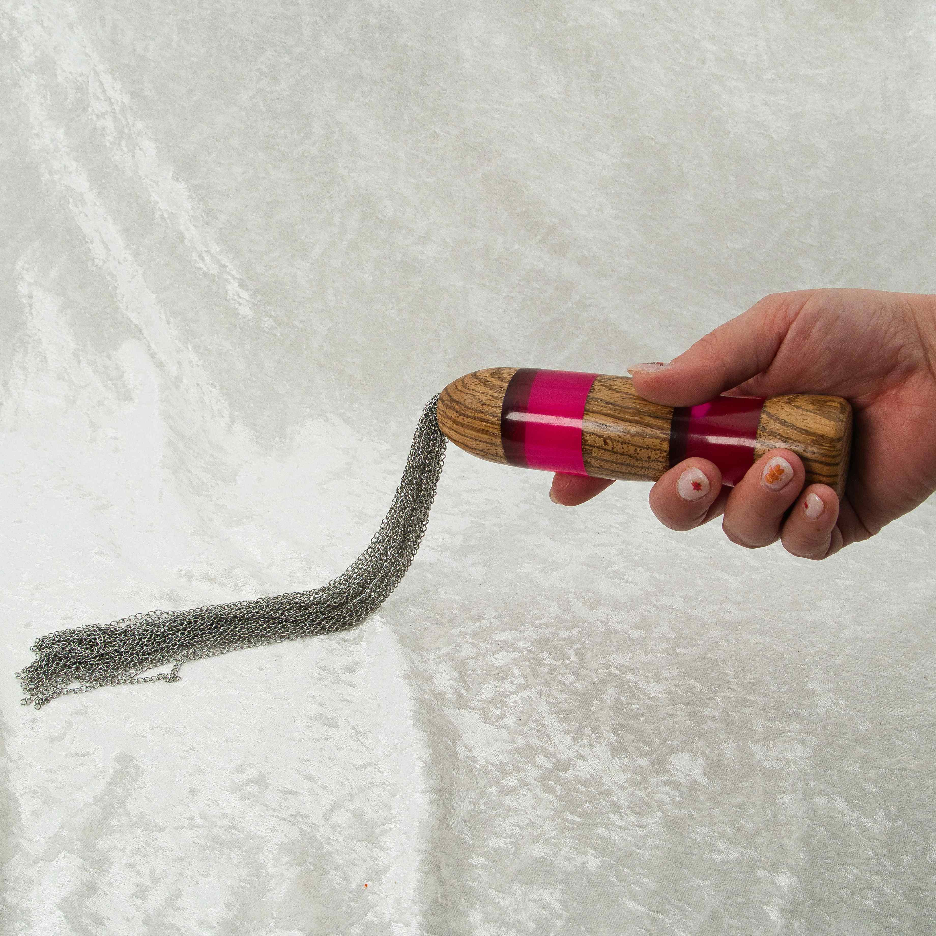 Die Kombination aus massivem Zebranoholz, ästhetisch tiefem Rotton im Epoxidharz und den flexiblen Edelstahlketten ergibt ein hochwertiges Werkzeug, das gleichermaßen funktional wie visuell beeindruckt. Die lebendige Farbwirkung des Harzes macht diesen Flogger zu einem Statement-Piece, das in jeder Sammlung hervorsticht.