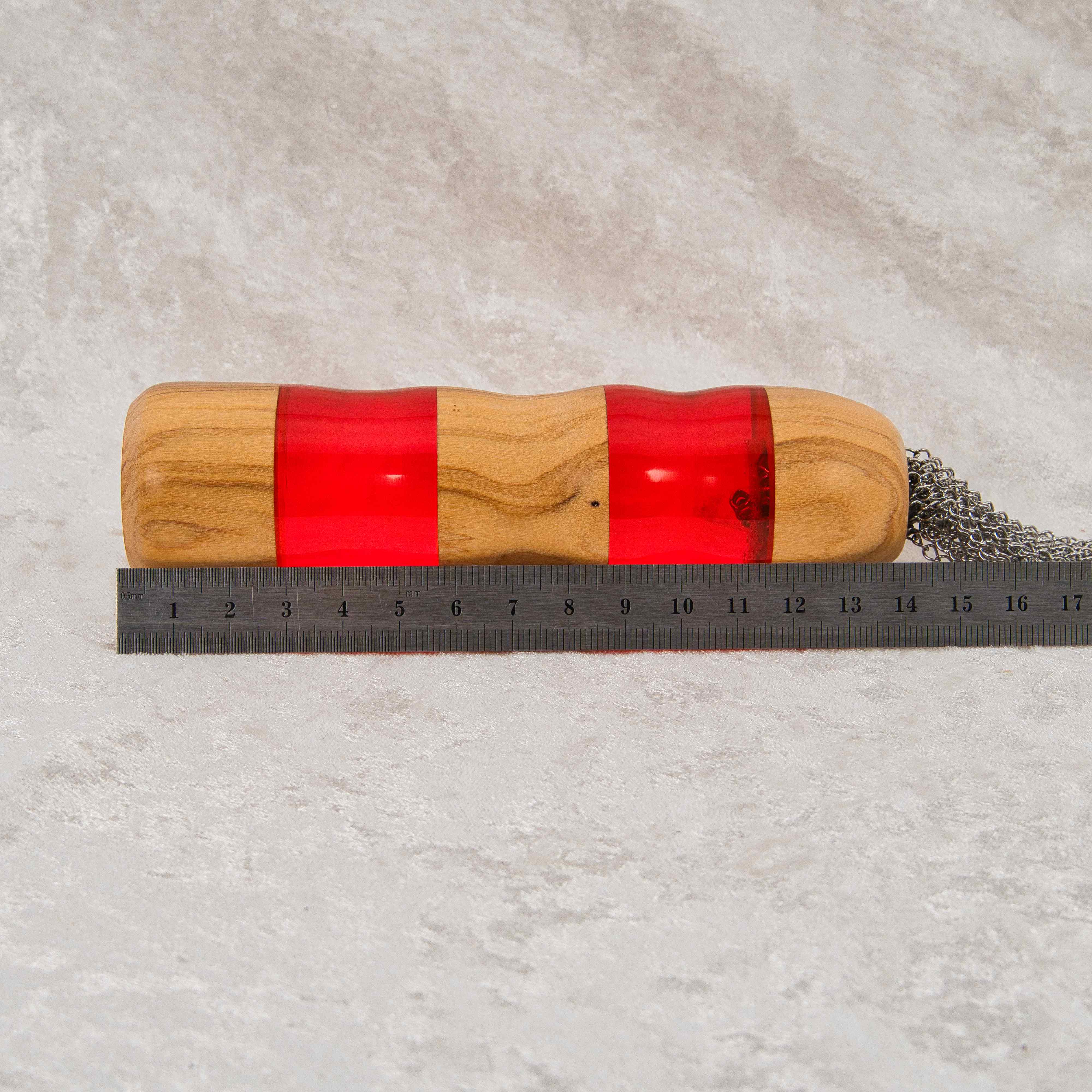 Der Kettenflogger verfügt über flexible Edelstahlketten mit einer Länge von ca. 27 cm. Die Ketten bestehen aus rostfreiem, langlebigem Edelstahl und erzeugen ein charakteristisches, tiefenwirksames Gefühl – ideal für abwechslungsreiches Spiel. Der ergonomische Griff ist aus wunderschön gemasertem Olivenholz gefertigt und mit kräftig rotem Epoxidharz kombiniert. Mit seinen 14,5 cm Länge liegt der Griff sicher und angenehm in der Hand, wodurch Präzision und Kontrolle beim Spielen mühelos möglich sind.