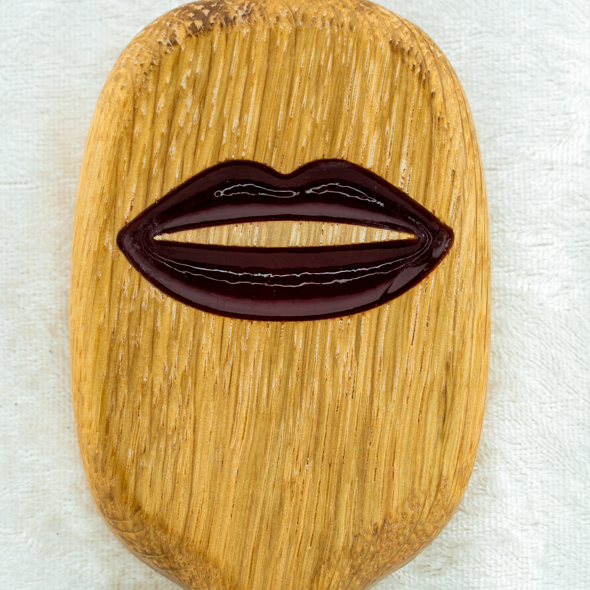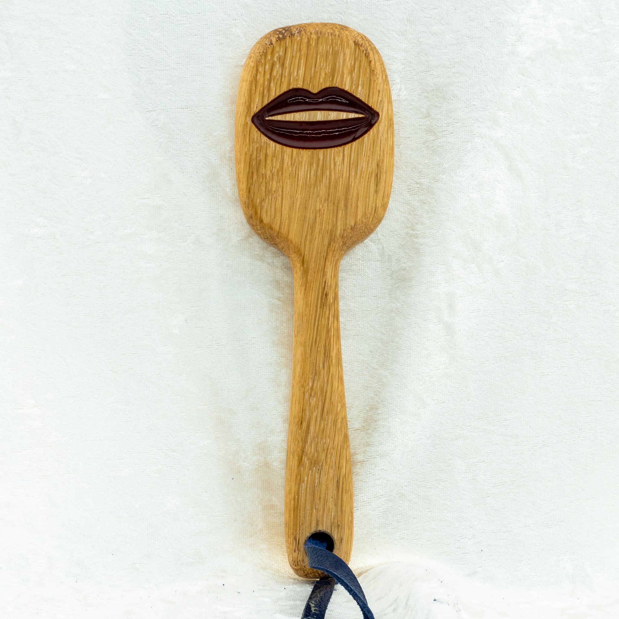 Das Paddle mit Kussmund-Motiv misst 20 cm in der Länge und 6 cm in der Breite. Das dekorative Lippen-Relief ist vollständig in das Holz eingelassen und hinterlässt beim Aufschlag einen deutlichen, charmanten Abdruck. Trotz seiner kompakten Form bietet das Paddle eine spürbare Wirkung und eignet sich hervorragend für spontane Sessions oder das dezente Mitführen unterwegs. Die natürliche Ölbehandlung macht die Oberfläche widerstandsfähig und angenehm glatt.
