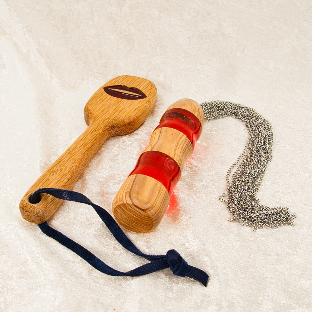 Edles BDSM-Einsteigerset: Kettenflogger aus Olivenholz & rotem Epoxidharz + Paddle mit Kussmund-Motiv. Hochwertig, kompakt & sofort versandbereit.